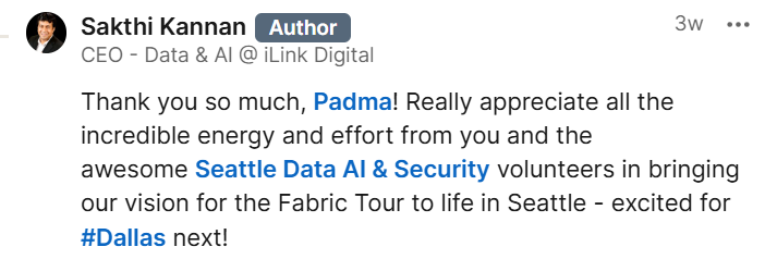 Really appreciate all the incredible energy and effort from you and the awesome Seattle Data AI & Security volunteers in bringing our vision for the Fabric Tour to life in Seattle – excited for #Dallas next!