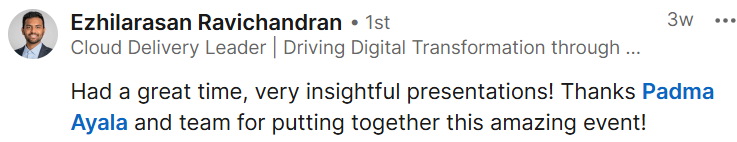 Had a great time, very insightful presentations! Thanks Padma Ayala and team for putting together this amazing event!