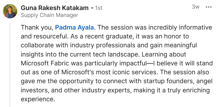The session was incredibly informative and resourceful. As a recent graduate, it was an honor to collaborate with industry professionals and gain meaningful insights into the current tech landscape. Learning about Microsoft Fabric was particularly impactful—I believe it will stand out as one of Microsoft’s most iconic services. The session also gave me the opportunity to connect with startup founders, angel investors, and other industry experts, making it a truly enriching experience.
