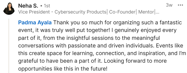 Thank you so much for organizing such a fantastic event, it was truly well put together! I genuinely enjoyed every part of it, from the insightful sessions to the meaningful conversations with passionate and driven individuals. Events like this create space for learning, connection, and inspiration, and I’m grateful to have been a part of it. Looking forward to more opportunities like this in the future!
