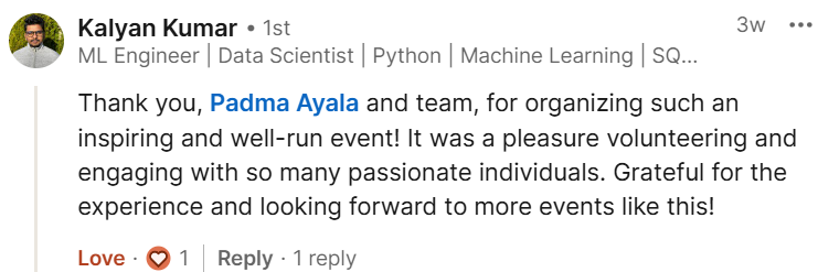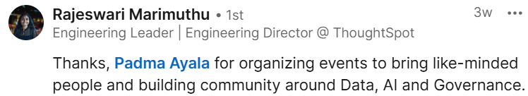 Thanks, Padma Ayala for organizing events to bring like-minded people and building community around Data, AI and Governance.