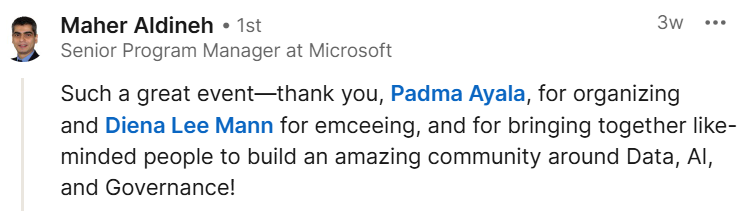 Such a great event—thank you, for organizing and Diena Lee Mann for emceeing, and for bringing together like-minded people to build an amazing community around Data, AI, and Governance!