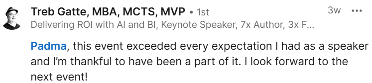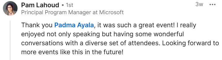 Padma, this event exceeded every expectation I had as a speaker and I’m thankful to have been a part of it. I look forward to the next event!